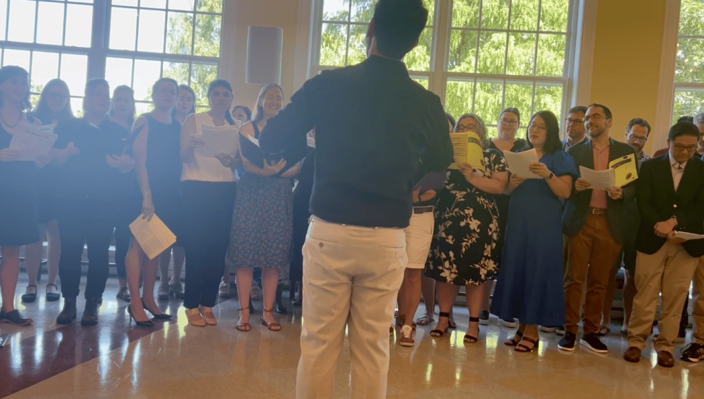 In the room that day, I stood alongside a few dozen of Mrs. Wich’s former students, spanning her three decades teaching at Hopkins. Even though many of us had never met, having been in different years and classes, we fell right into our parts, tapping into our muscle memories. In unison, we sang three of her favorite compositions from the songbook she used to teach us.
