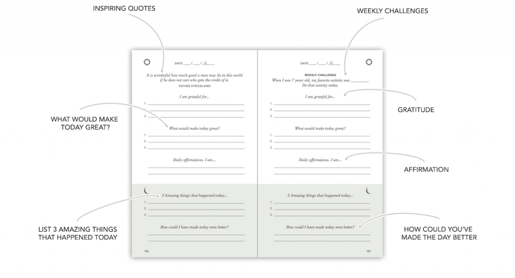 Over five-years ago, a member of my “circle of trust” shared her experience using the journal. She took it out of her bag, showing us the well-worn pages in the front half with the soon-to-be filled out daily pages that followed. “Everyone has five minutes,” she argued. ”And really, it’s only three in the morning and two at night.” Then, she said: “It’s worth it. I promise.”